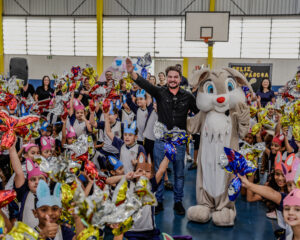 O prefeito de Arapongas, Rafael Cita, participou da entrega de ovos de Páscoa para alunos da Escola Municipal Papa